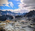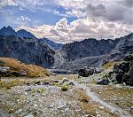 Grabbing a sandwich to go—that is some slices of bread and cheese—I speed through the aid station at the Auberge, and begin the next ascent to the Col de Susanfe with its peculiar landscape. Looking down in the Lac de Susanfe, incident with the Haut Cime, a summit in the prominent Dents du Midi, the pass is composed of a series of strange-looking domes.