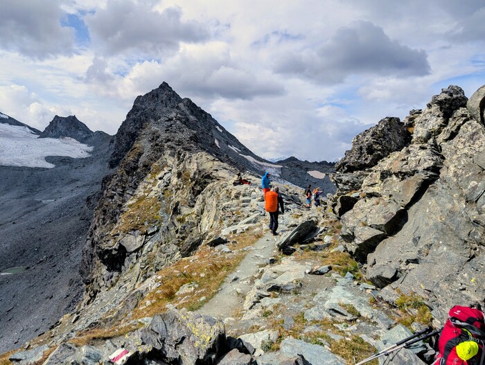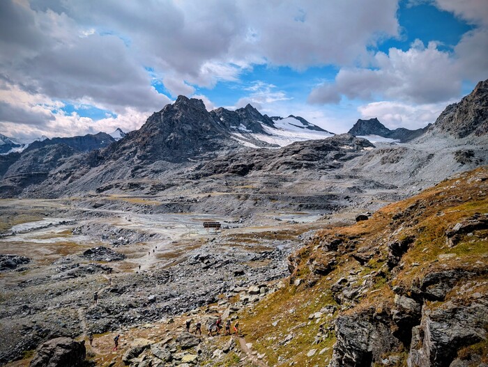 After Lourtier comes a steep uphill climb to the Cabane de Brunet. This time, I misjudge how many runners to overtake, and settle on an unsustainably uphill pace; with poles, but without gloves, of course. This mistake haunts me on the remaining climb, and I readily give in to a strong urge to down several chocolate pieces at the Cabane in short succession. Revived by the chocolate, almost locked in again by the arriving runners in the little foyer, I set off again.